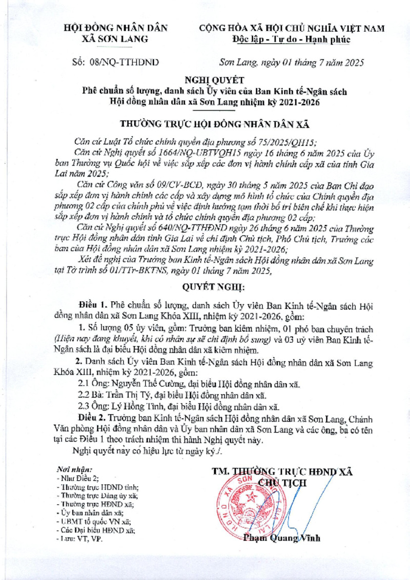 | Tiêu đề văn bản | Nghị quyết Nghị quyết về phê chuẩn số lượng, danh sách Phó Trưởng ban hoạt động chuyên trách và Ủy viên là ĐB HĐND hoạt động kiêm nhiệm của Ban Kinh tế - Ngân sách HĐND xã Sơn Lang - Khóa XIII, nhiệm kỳ 2021 – 2026. | ||