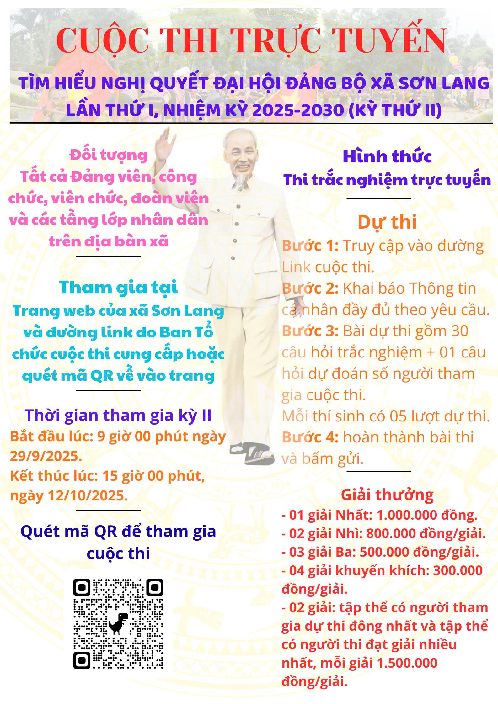 Thực hiện Kế hoạch tổ chức Cuộc thi trực tuyến tìm hiểu Nghị quyết Đại hội Đảng bộ xã Sơn Lang lần thứ I, nhiệm kỳ 2025–2030, sáng nay (ngày 29/9/2025), Ban Tổ chức cuộc thi tiếp tục phát động Kỳ thi thứ 2.